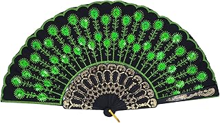 (Green) - Amajiji Folding Fans for Women,Handmade Elegant Colourful Embroidered Flower Peacock Pattern Sequin Fabric Folding Fans (Green)